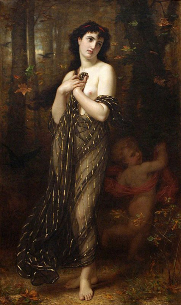 Catharine Lorillard Wolfe bought the melancholic picture from the New York branch of the art gallery Goupil & Co. on February 21, 1873, while still in mourning for her father. A critic who saw the work in Wolfe’s home remarked, "Here, under russet foliage, a ripe beauty passes…. Nearby, disguised so much in shadow as to be almost invisible, little Love is running away; for this bereavement of affection is the plague of life’s Autumn, as love’s importunity is the plague of its Spring." More on this painting