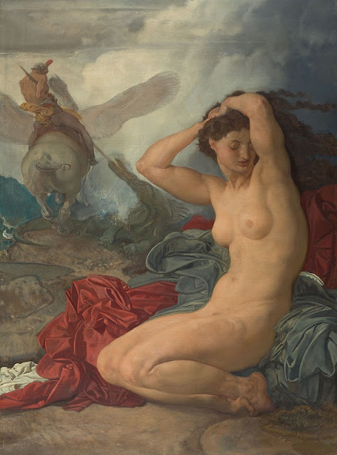 In Greek mythology, Andromeda is the daughter of the Aethiopian king Cepheus and his wife Cassiopeia. When Cassiopeia's hubris leads her to boast that Andromeda is more beautiful than the Nereids, Poseidon sends a sea monster, Cetus, to ravage Aethiopia as divine punishment. Andromeda is stripped and chained naked to a rock as a sacrifice to sate the monster, but is saved from death by Perseus. More on Perseus and Andromeda